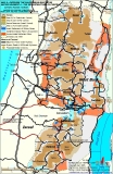 To fully understand the role of the highway grid in completing the process of incorporation, one must link these West Bank developments to the ambitious Trans-Israel Highway project. Already in 1977, in his Master Plan for the settlement and incorporation of the West Bank, Sharon presented his "Seven Stars" plan calling for contiguous Israeli urban growth straddling both sides of the "Green Line." The Trans-Israel Highway, which hugs the border of the West Bank, provides a new "central spine" to the country. Hundreds of thousands of Israelis will be resettled in the many towns and cities planned along the length of the highway, especially along the "Green Line" and in areas of the Galilee heavily populated by Arabs. New and expanded Israeli cities, towns and settlements on both sides of the Green Line form a new "metropolitan core-region" in which Metropolitan Tel Aviv (including the Modi'in area settlements, Rosh Ha-ayin and the Ariel bloc) meets Metropolitan Jerusalem (stretching from Modi'in, Kiryat Sefer, Beit Shemesh and the Etzion Bloc across the most of the central West Bank to the settlements east of Ma'aleh Adumim. The Trans-Israel Highway, articulating as it does with the highways and settlement blocs of the West Bank, moves the entire population center of the country eastward, reconfiguring the entire country.